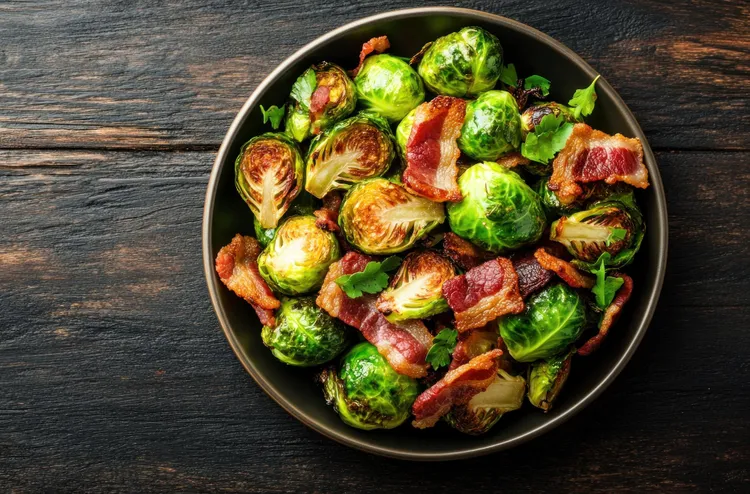 Roast at 220°C for 20-25 minutes until the cut sides are deeply caramelised and the bacon is crispy. Scatter 80g toasted pecans and a final drizzle of balsamic over the top.