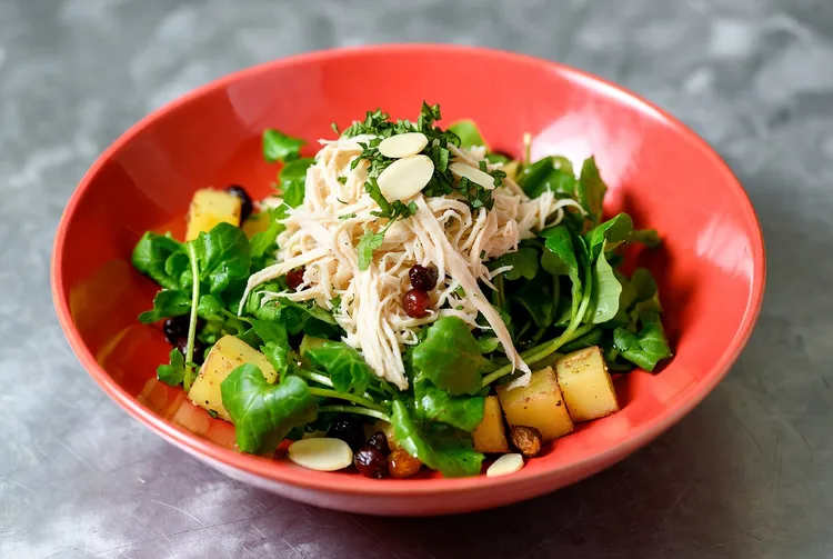 - Gently toss the shredded chicken, cooked potatoes, watercress, spearmint, and almonds along with the currants in a large bowl. Pour the dressing over and mix lightly to coat all the ingredients evenly.