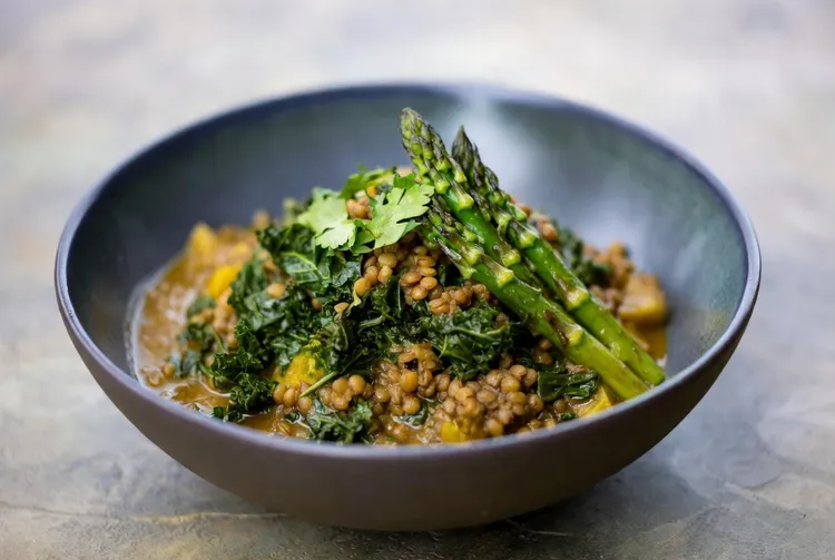 Curried lentils with kale and asparagus is a nutritious and flavorful dish that's perfect for a hearty meal. Combining tender lentils with fresh kale and crisp asparagus, this recipe is infused with aromatic spices and a hint of lemon for a delightful tang. It's a versatile dish, ideal for vegetarians and those looking for a healthy, wholesome meal.