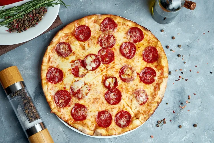 The pizza is done when the cheese is bubbly and slightly browned, and the pepperoni appears crisp. The crust should also have a light golden color.