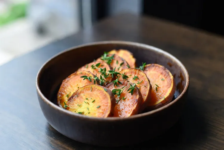 Maple-baked sweet potatoes are a delicious and nutritious side dish perfect for any meal. The natural sweetness of the sweet potatoes is enhanced by the rich flavors of maple syrup and butter, while fresh thyme adds a hint of aromatic freshness. This simple yet flavorful recipe will be a hit at your dining table.