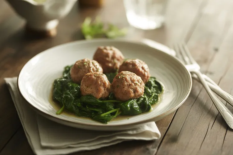 These maple pork meatballs are a delightful blend of savory pork and sweet maple flavors that are sure to impress. Paired with fresh spinach, they make for a complete and satisfying meal. Enjoy them as a main dish or serve them as a tasty appetizer. Either way, they're bound to be a hit.