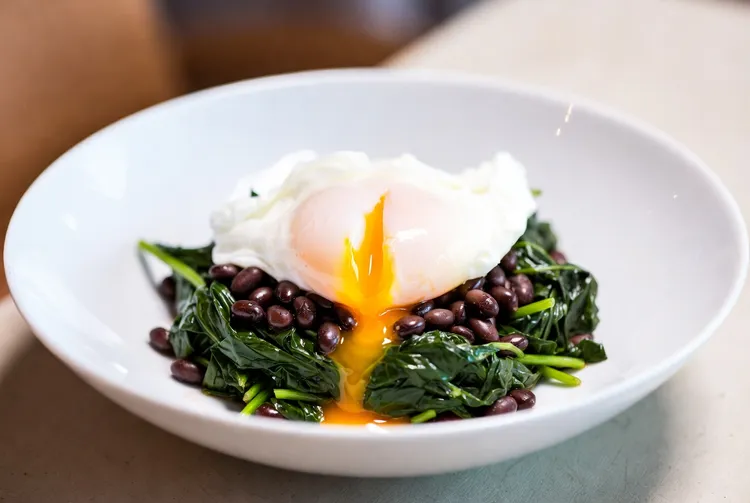 Enjoy your perfectly poached eggs served over a bed of wilted spinach and black beans. This healthy and satisfying dish is sure to become a staple in your meal routine.