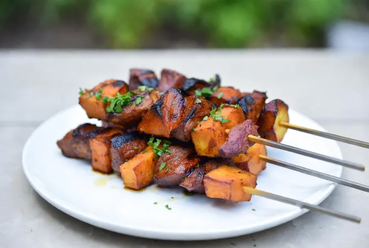 Grill the skewers for about 10-12 minutes, turning occasionally. Ensure the pork is fully cooked and has a nice char, and the sweet potatoes are tender.
