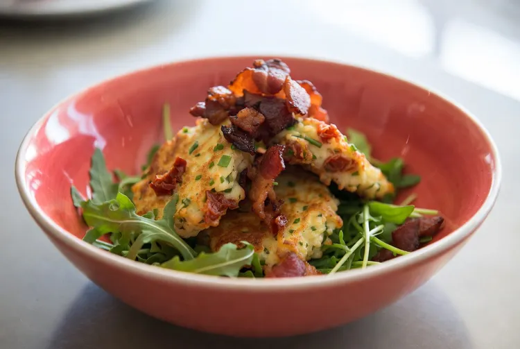 - For an extra crispy texture, you can fry the bacon before crumbling it over the fritters.