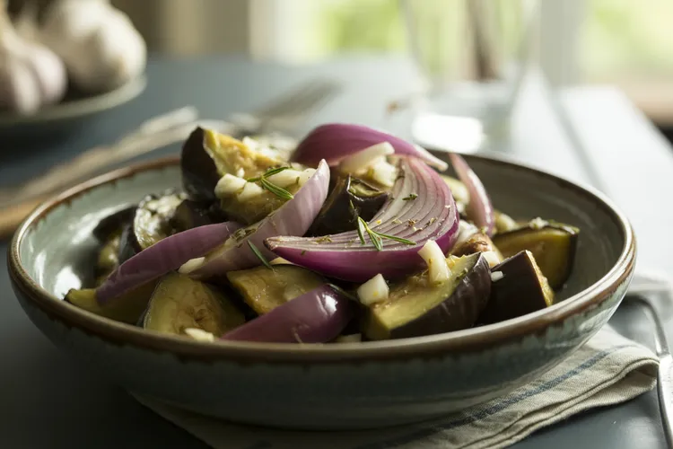 Roasted eggplant and red onion with rosemary and garlic is a flavorful and healthy dish that is perfect as a side or a main course. The combination of rosemary and garlic infuses the vegetables with a rich aroma, while the roasting process brings out their natural sweetness. This easy-to-make recipe is ideal for a weeknight dinner or a special occasion.