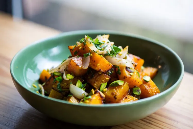 Mixed roasted pumpkin is a simple yet delicious dish that brings together a mix of textures and flavors. The combination of roasted pumpkin, crunchy pistachios, and aromatic shallots and spearmint makes for a delightful and nutritious meal. Serve it warm and enjoy the burst of flavors with each bite.