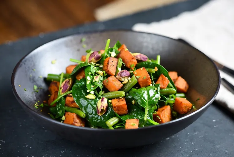 Roasted sweet potato & spinach salad is a delicious and nutritious dish that combines the natural sweetness of roasted sweet potatoes with the fresh, leafy greens of spinach. Enhanced by the aromatic spices of coriander, cumin, and cinnamon, and complemented by the crunch of green beans and pistachio nuts, this salad becomes a balanced and flavorful meal. The addition of a creamy Greek yogurt dressing with a hint of garlic, chili pepper, honey, and lemon juice brings it all together beautifully.