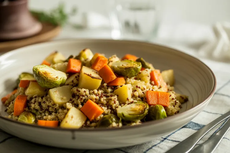 Experience the wholesome goodness of autumn in a bowl with our Roasted Vegetable & Quinoa Harvest Bowls. Packed with nutrient-rich ingredients like carrots, potatoes, brussels sprouts, and quinoa, this comforting recipe is sweetened with maple syrup and accented with aromatic rosemary. It's a perfect, hearty meal that's not only good for you but also easy to prepare.