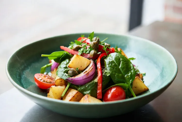 Roasted vegetable salad with caper dressing is a delicious and healthy dish that combines the earthy flavors of roasted potatoes, sweet red onions, and vibrant red peppers with a zesty caper dressing. This salad is perfect for a light lunch or a hearty side dish, and it's packed with nutritious ingredients like spinach and cherry tomatoes.