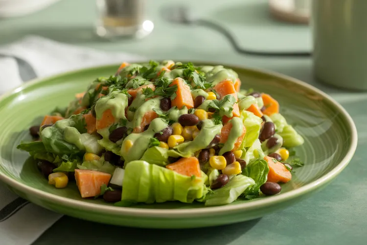 - Assembling the Salad: Layer the lettuce at the bottom of your serving bowl, then add the roasted sweet potatoes, black beans, and sweet corn. Drizzle the avocado-yogurt dressing over the top just before serving to keep the salad crisp.