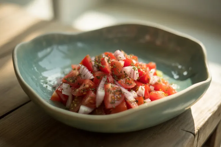 Enjoy a taste of the Mediterranean with this fresh thyme tomato salad. This vibrant dish combines the aromatic flavors of fresh thyme and onions with the tangy notes of lemon juice and tomatoes, all brought together with a dash of salt and a hint of olive oil. Quick and easy to prepare, this salad is perfect as a light appetizer or a refreshing side dish.