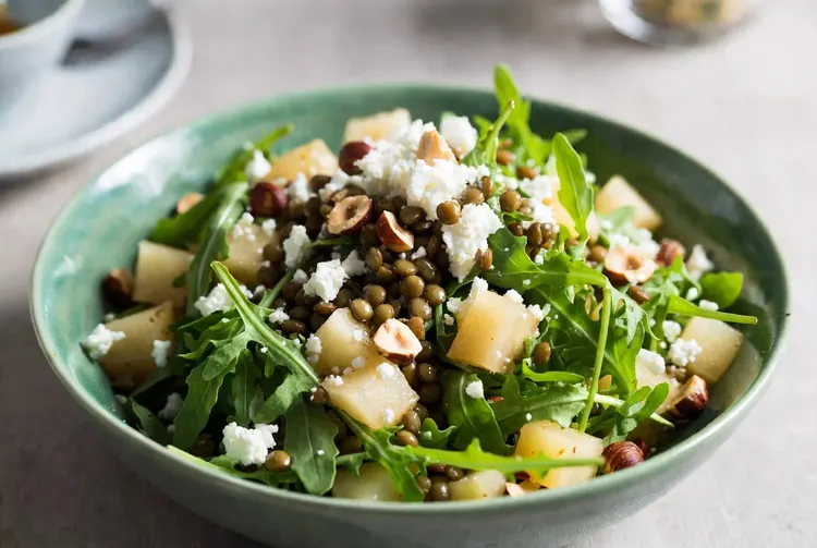 Discover a delightful blend of flavors with this Warm Lentil Salad featuring hazelnuts, pear, feta, and arugula dressed in a tangy vinegar dressing. This nutritious salad makes for a perfect light meal or a refreshing side dish, combining the earthiness of lentils, the crunch of hazelnuts, the sweetness of pear, and the creaminess of feta with the peppery touch of arugula.
